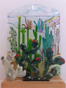 2022Een sfeervol decor van glas-cactussen, tegen een op glas geschilderde achtergrond.van een tropisch eiland. Gemaakt deels met gerecyled autoglas, deels 96 glas. Een vrolijke tegenstelling tussen de stekelige planten en de prachtige bloemen die ze laten zien. Het geheel staat op een blikje hout in 3 gleuven, van 19 x 8 x 2,5 cm.