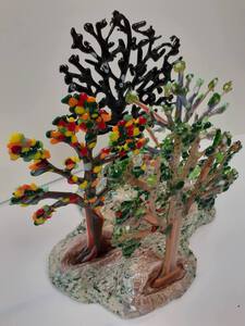 2023Een vrolijke samenstelling van 4 bomen in de 4 seizoenen. De bomen zijn gemaakt van vooral 96 glas, en de winterboom van gerecycled glas. Alle bomen zijn gemonteerd op een heuvel van geglazuurd keramiek.