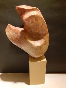 2025Grijsgroene serpentijn werd bewerkt met beitel en rasp, om te komen tot een mooie organische vorm. Op houten sokkel met pin.Totale hoogte incl. houtblok van 17x11x7 is 39 cm. Dit beeld heeft van alle kanten prachtige vloeiende vormen en verrassende vlakken. Het kunstwerk dateert al, in de eerse versie, uit 2019, maar is 2 x opnieuw bewerkt, met voortschrijdend inzicht, ervaring, kennis en ontwikkeling van een eigen stijl.